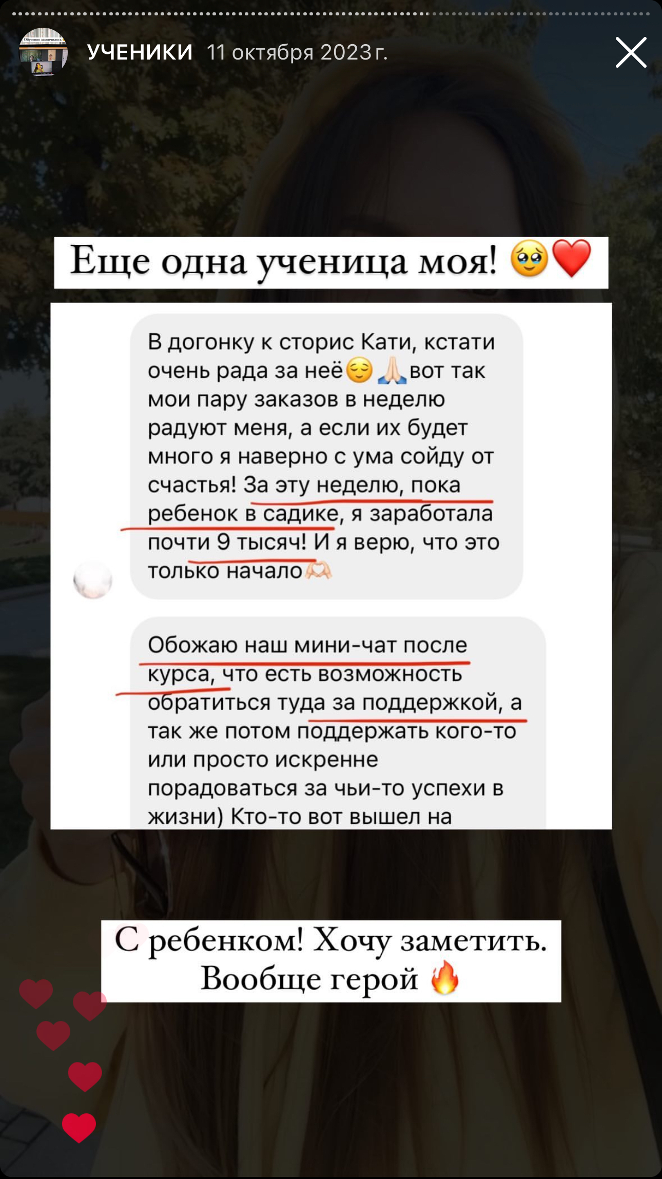 На все 100500% оправдал ожидания, даже превзошел Больше всего понравилась обратна связь и что она остаётся и после курса. Хочется сказать огромное спасибо Даше за ее обучение и поддержку. Я прошла более 8 курсов, но самый лучший и информативный был тот самый.