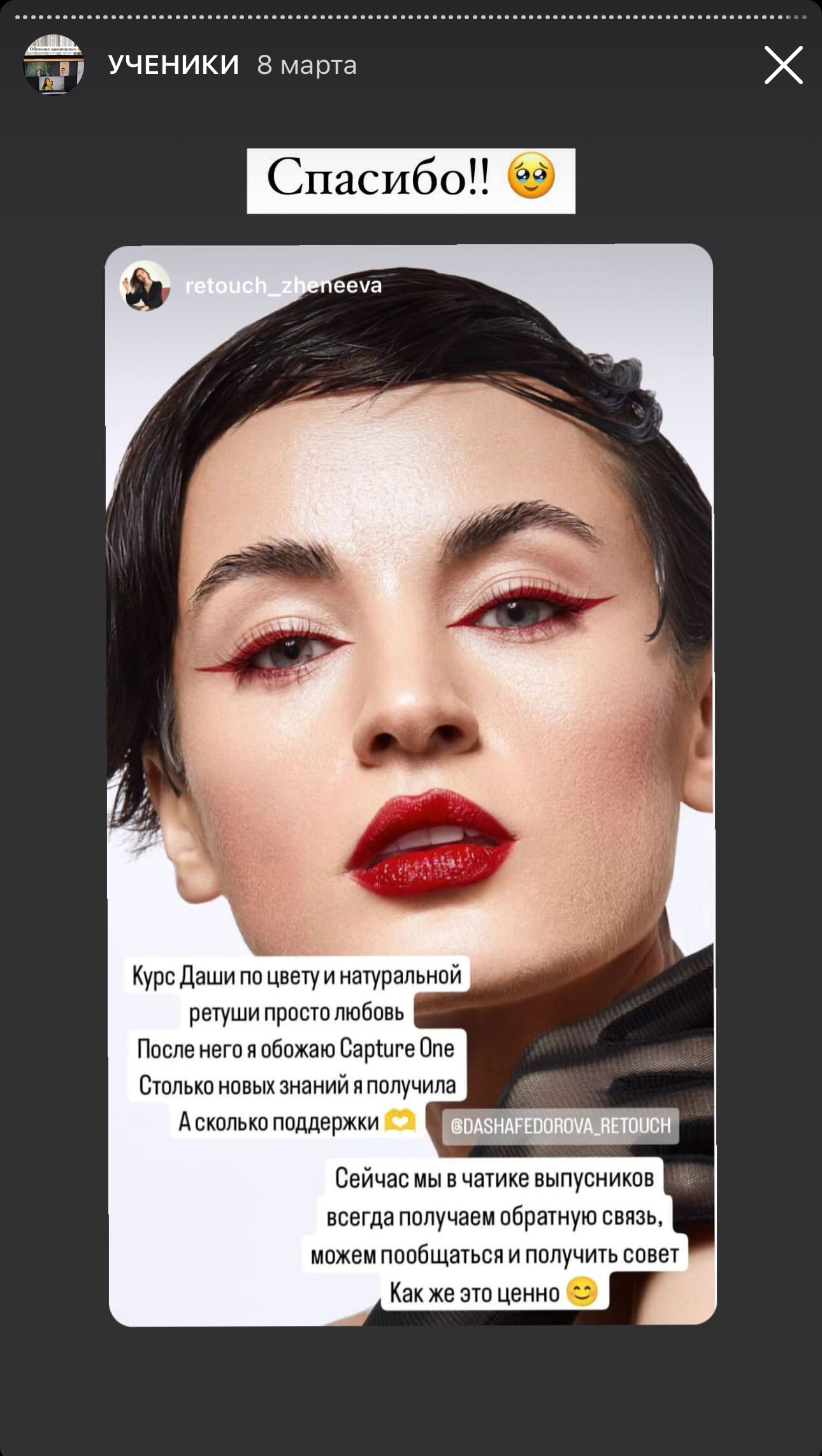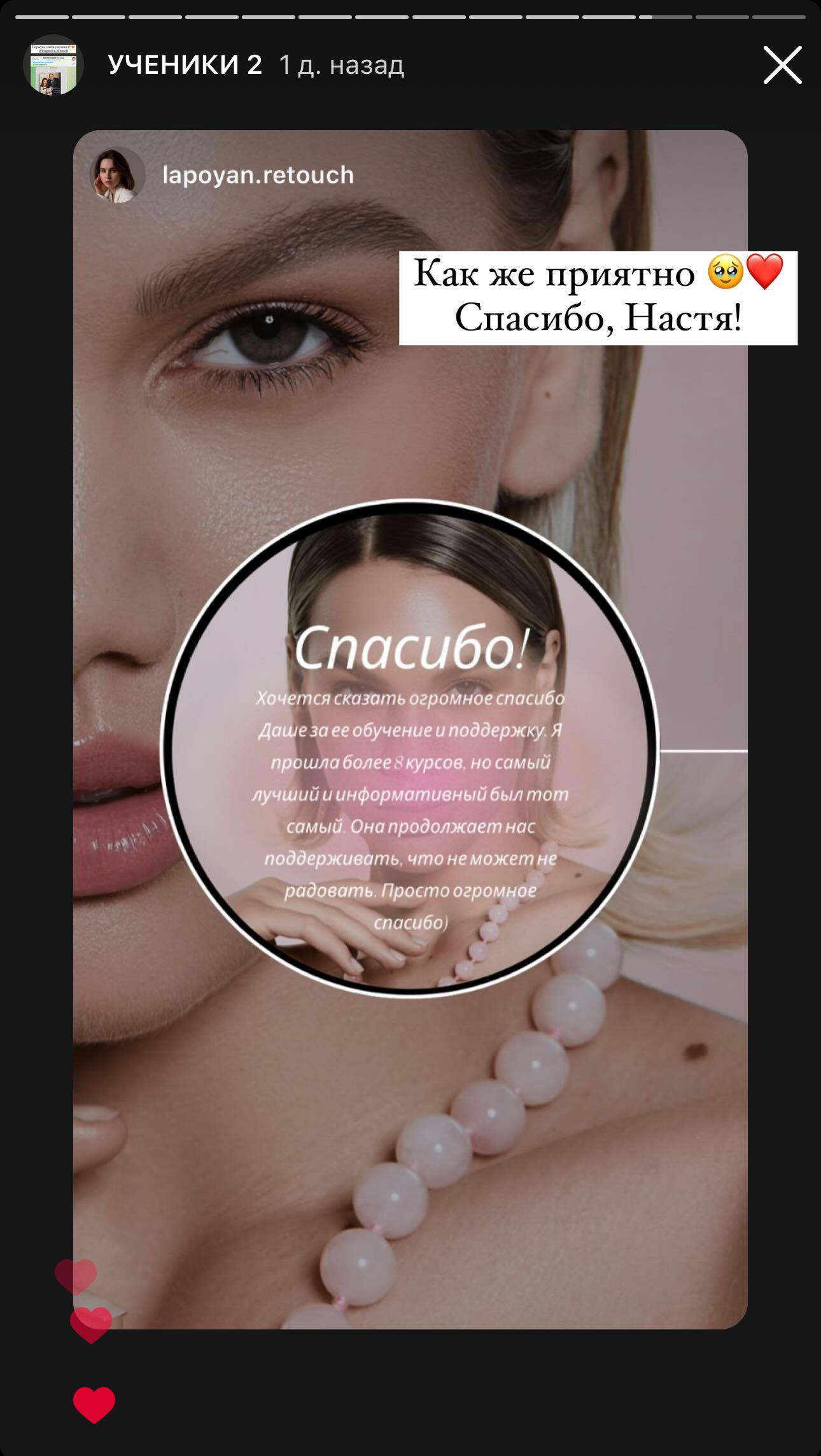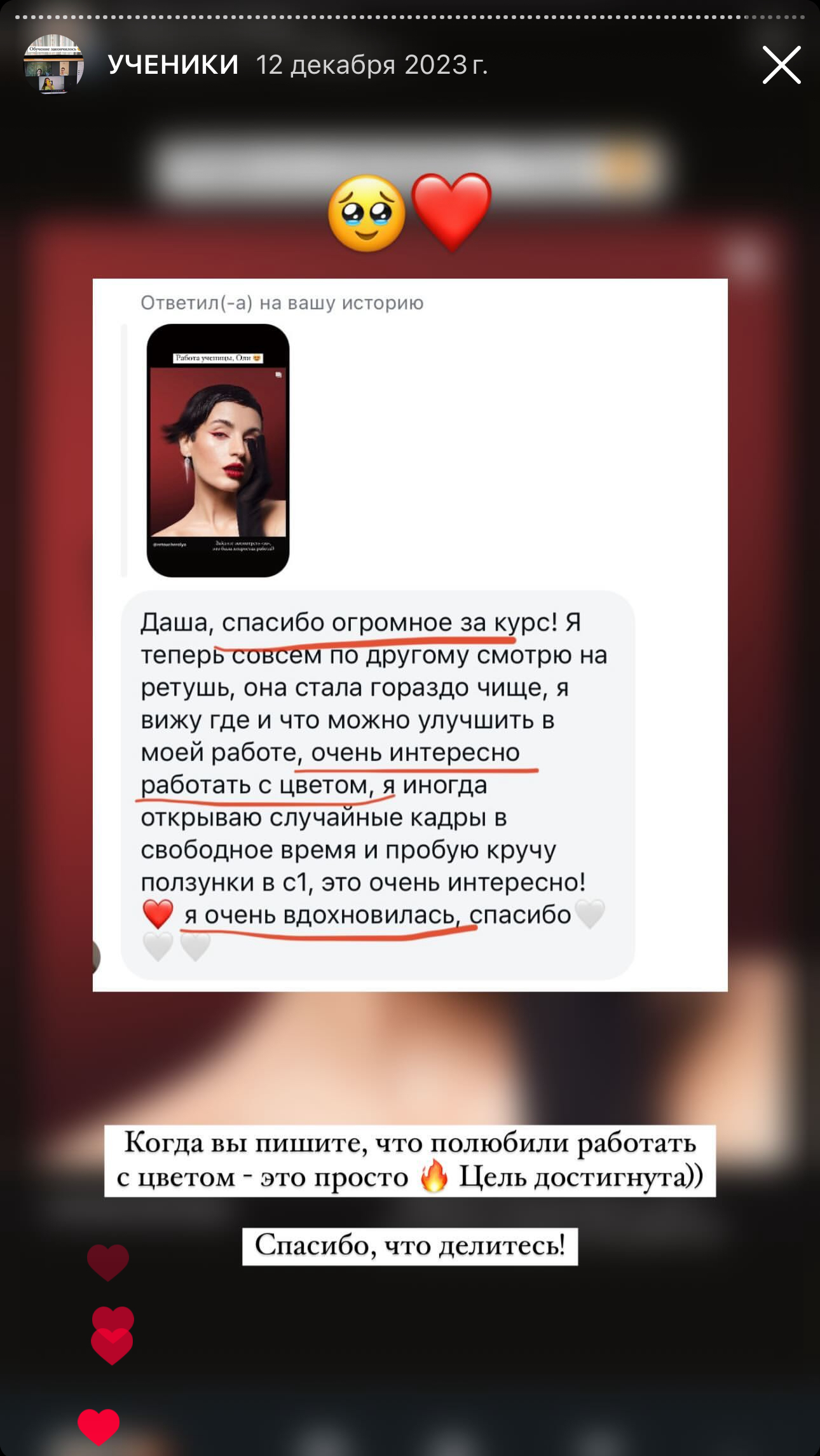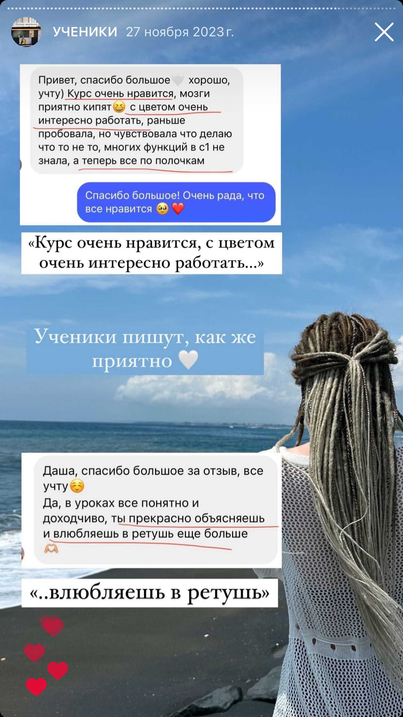 «Понравилось что все четко и по делу, понятно объясняете все техники. Все было понятно! Я обожаю вашу ретушь! ❤️»