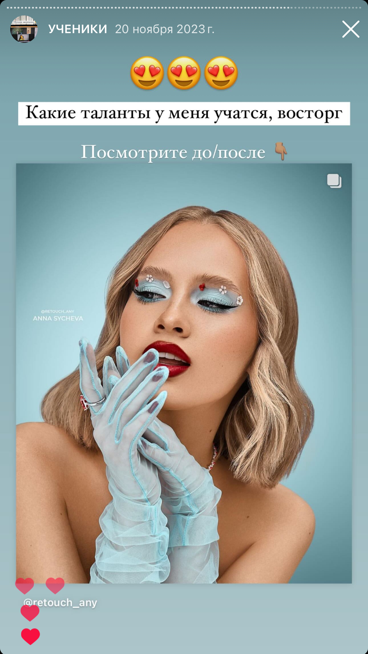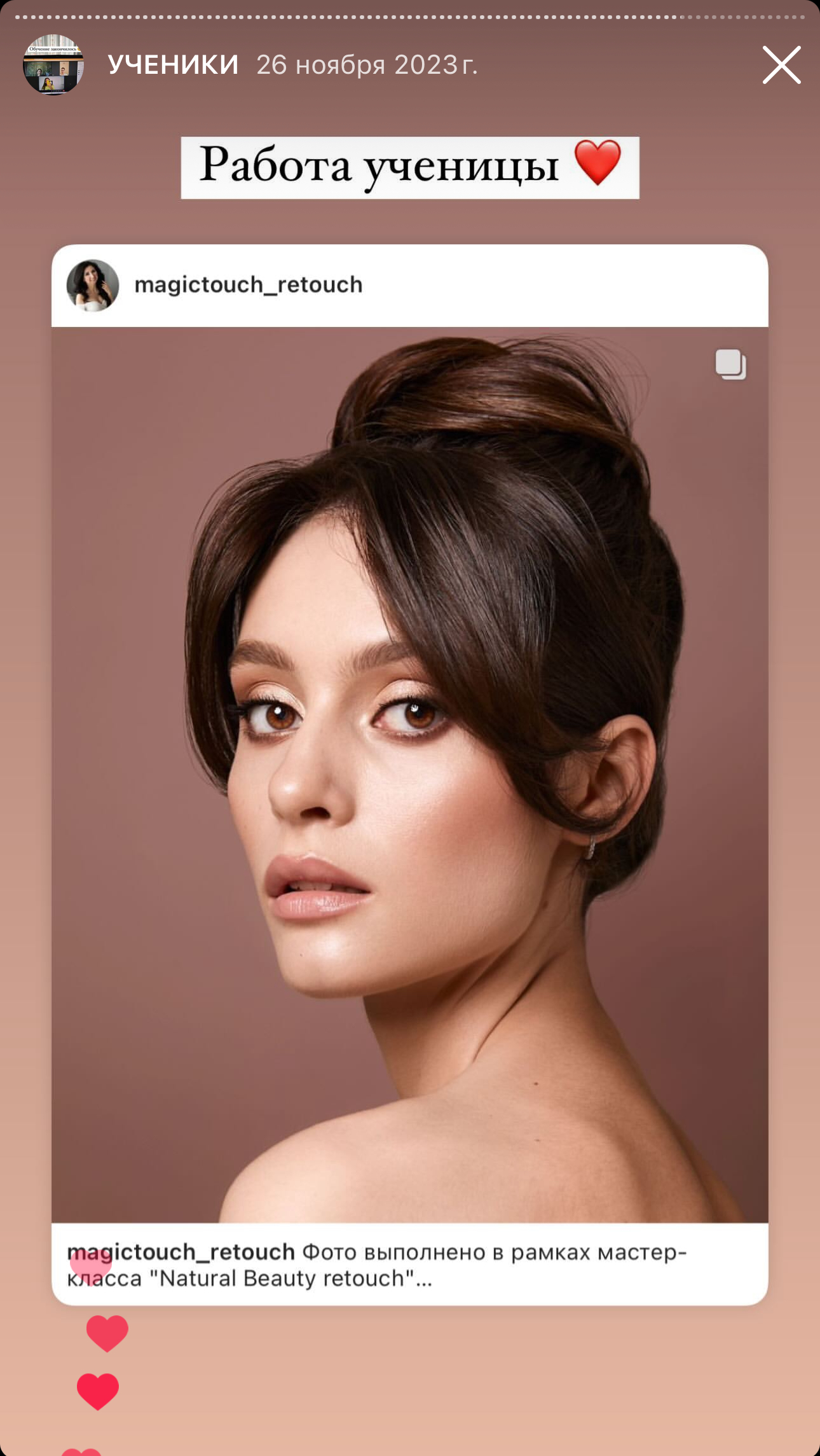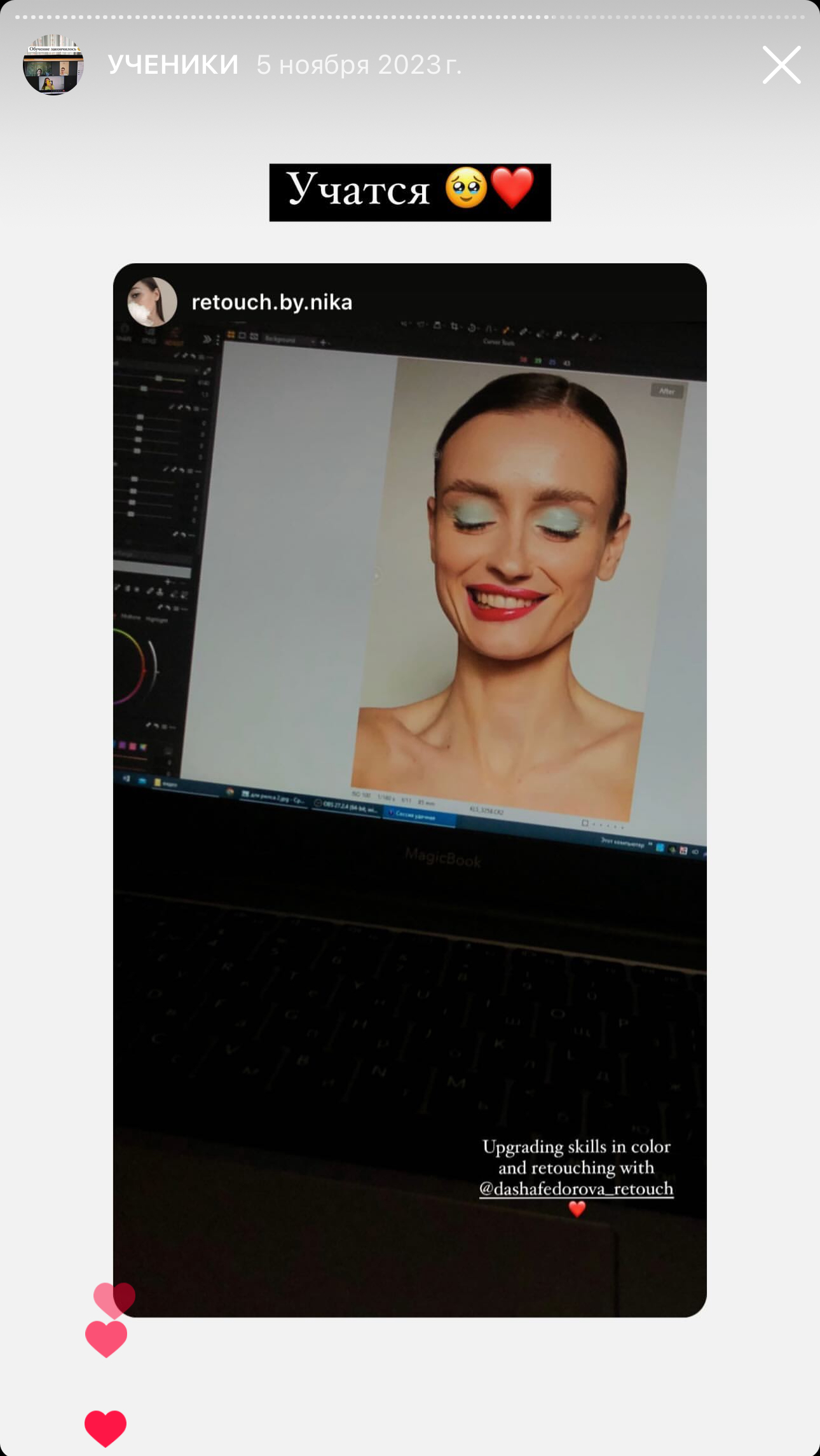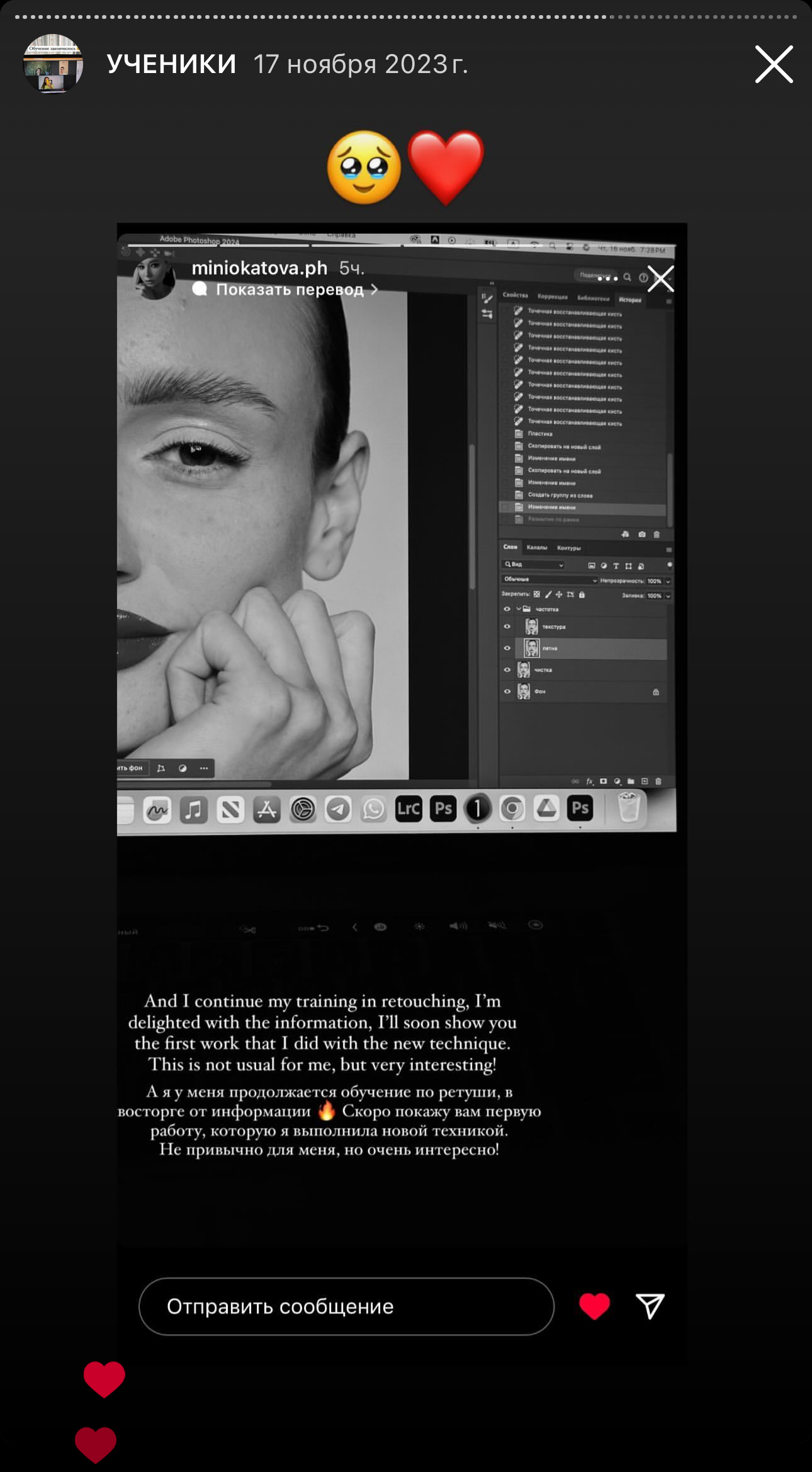 «Понравилось что все четко и по делу, понятно объясняете все техники. Все было понятно! Я обожаю вашу ретушь! ❤️»