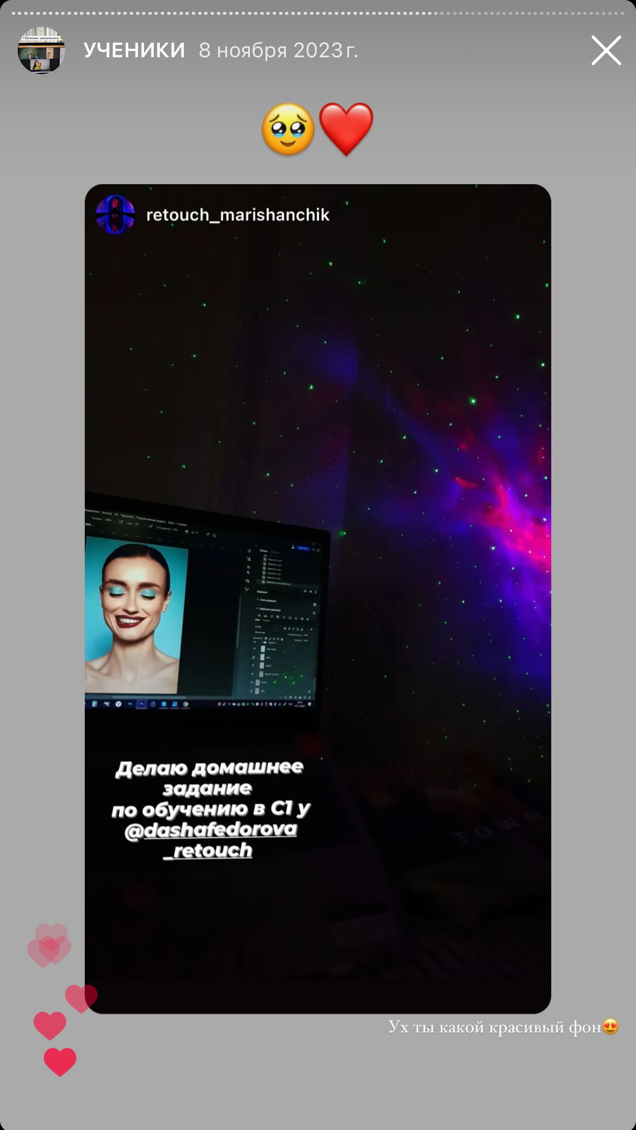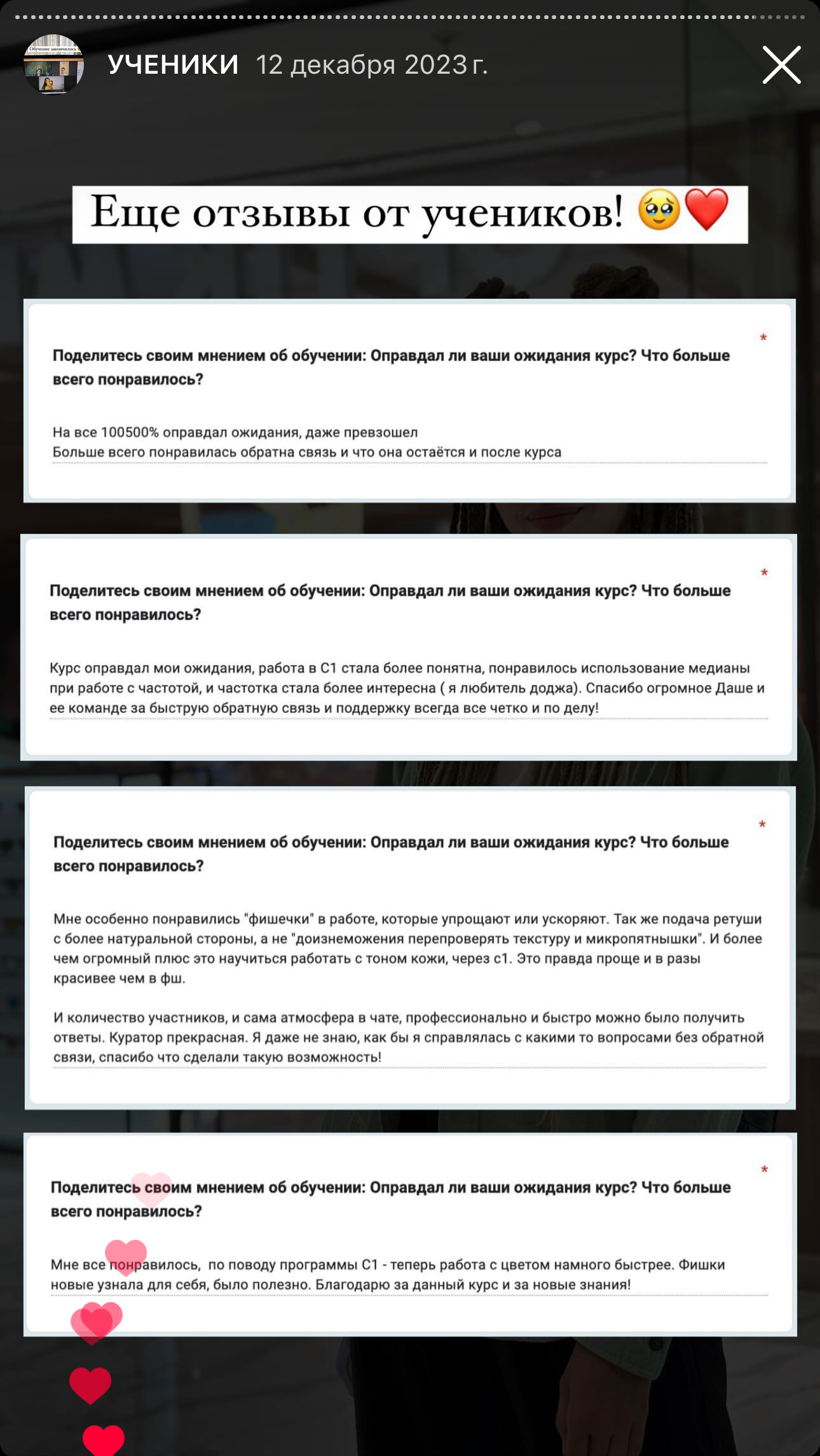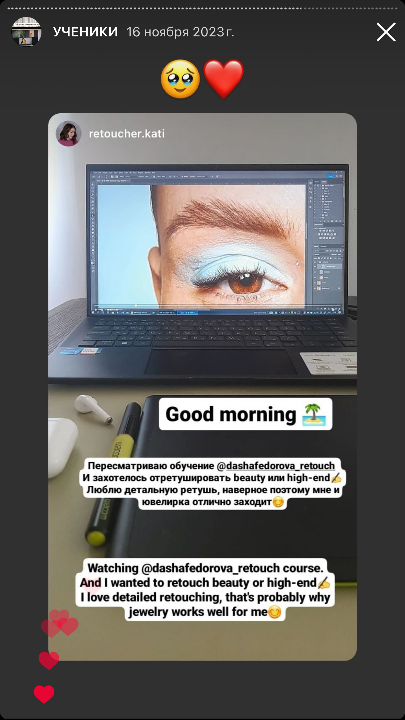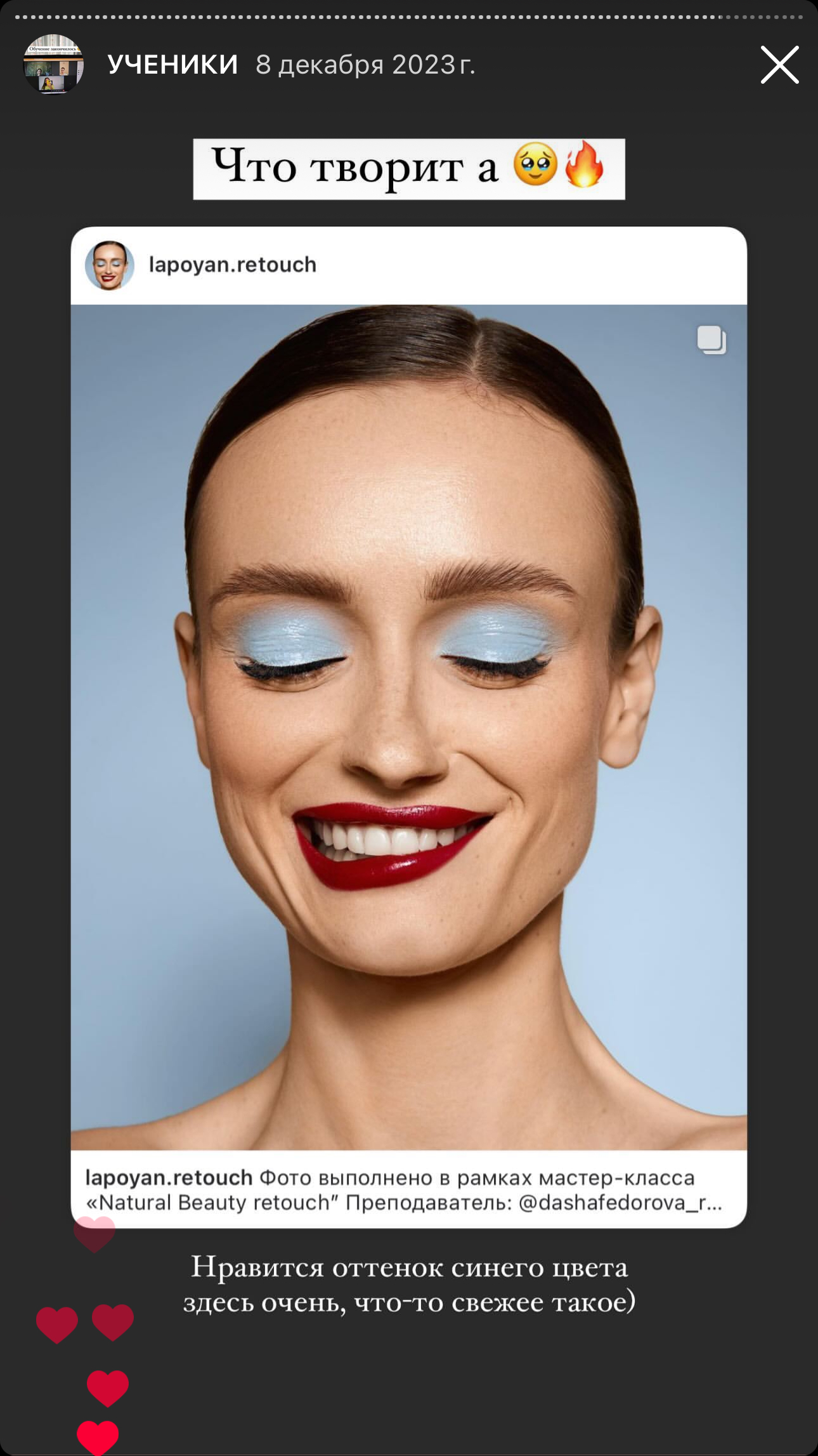 «Понравилось что все четко и по делу, понятно объясняете все техники. Все было понятно! Я обожаю вашу ретушь! ❤️»