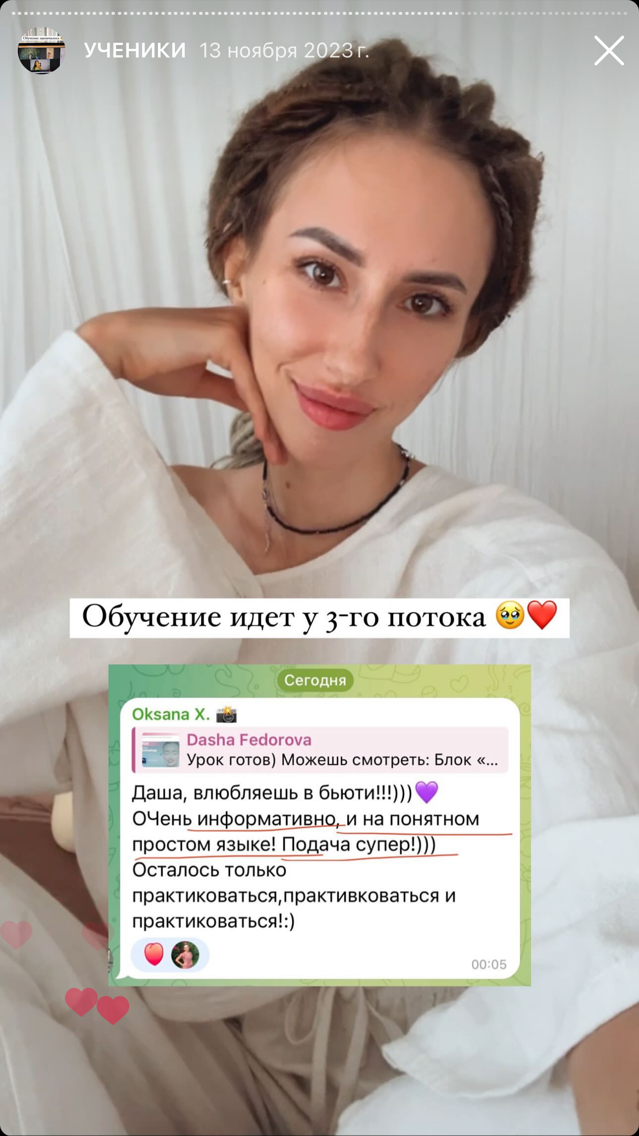 «Даша, влюбляешь в бьюти!!!)))💜 ОЧень информативно, и на понятном простом языке! Подача супер!))) Осталось только практиковаться, практиковаться и практиковаться!:)»
