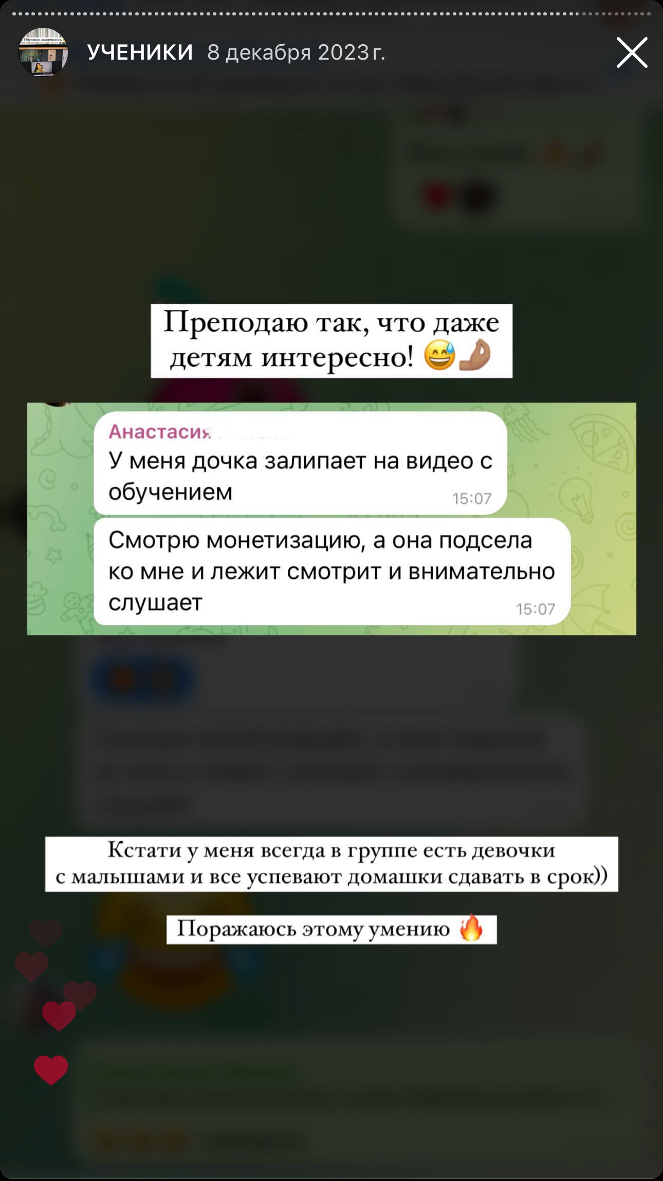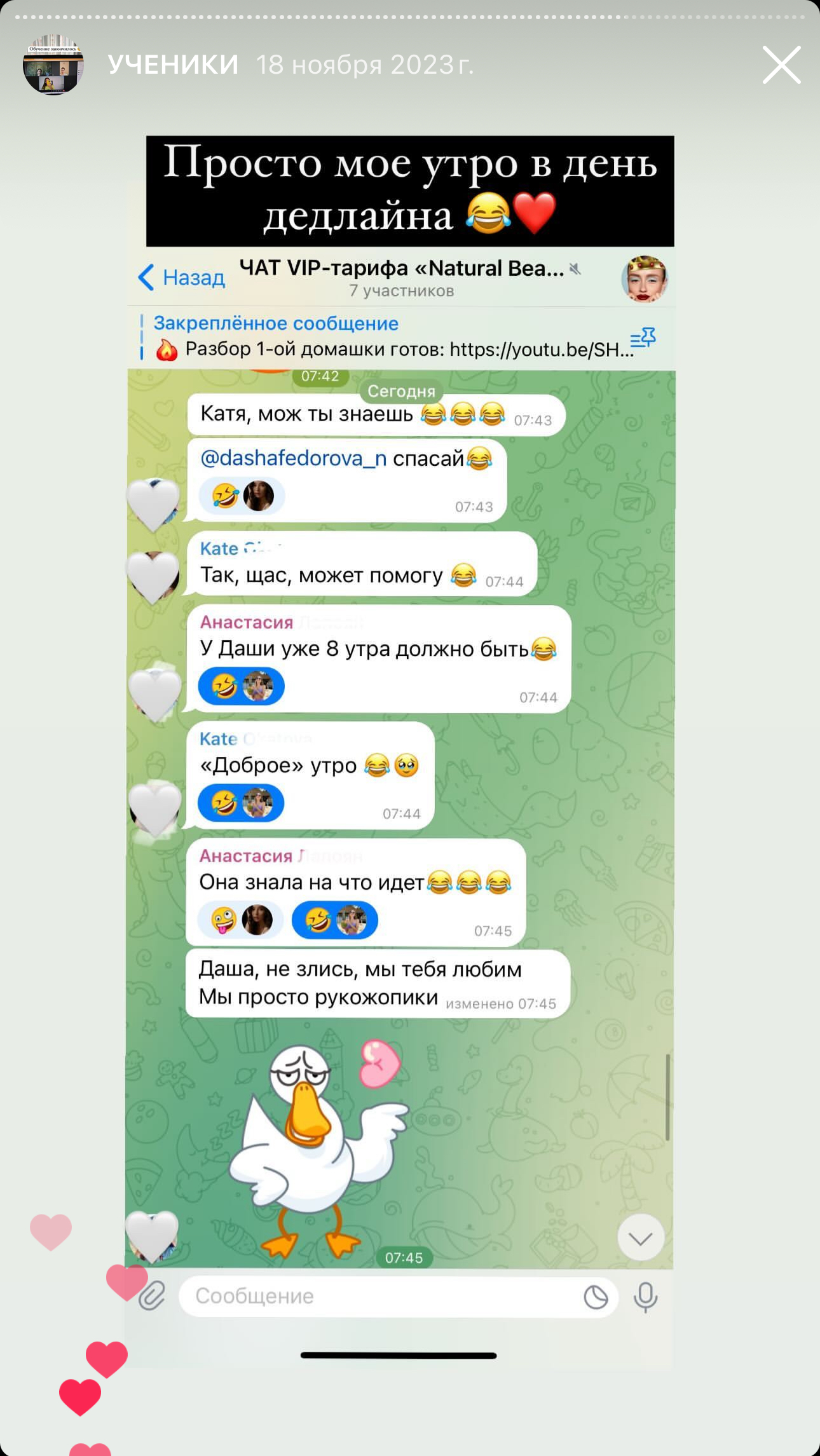 «Даш, спасибо большое))) Вы большие молодцы!!! Я читаю чат и такая поддержка, класс, да и в целом, когда я начинала пару уроков смотреть и уже тогда была в восторге,как ты всё объясняешь,…»