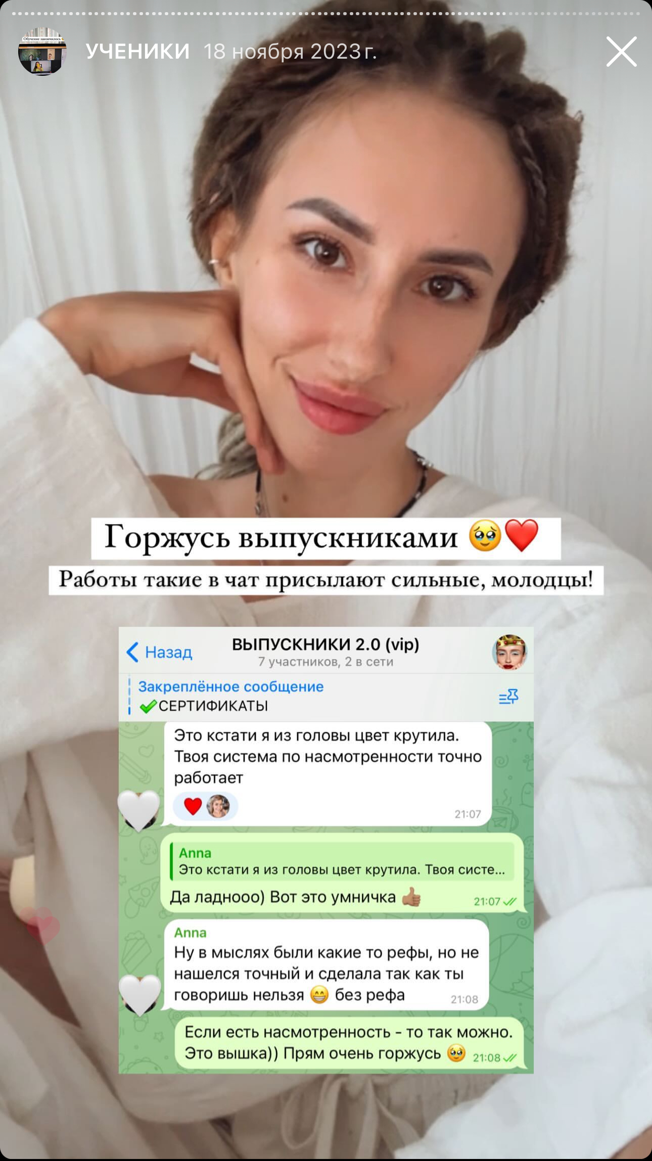 «Понравился очень алгоритм работы , из всех обучений которые проходила, этот оказался самым близким и понятным. Всё очень чётко, ничего лишнего. Тема с1 вообще всегда была для меня сложной и далекой, теперь всё очень предельно понятно, скажу одно, волшебной таблетки нет , и чтобы научится делать цвет нужна лишь практика, практика и еще раз практика! Ну и насмотренность) если раньше крутила ползунки до бесконечности ,часами, то сейчас работая с референсом время в разы уменьшилось, более понятно стало как искать оттенок в тенях или полутенях) вообщем ни капли не пожалела, что пришла на курс, всем советую однозначно!»