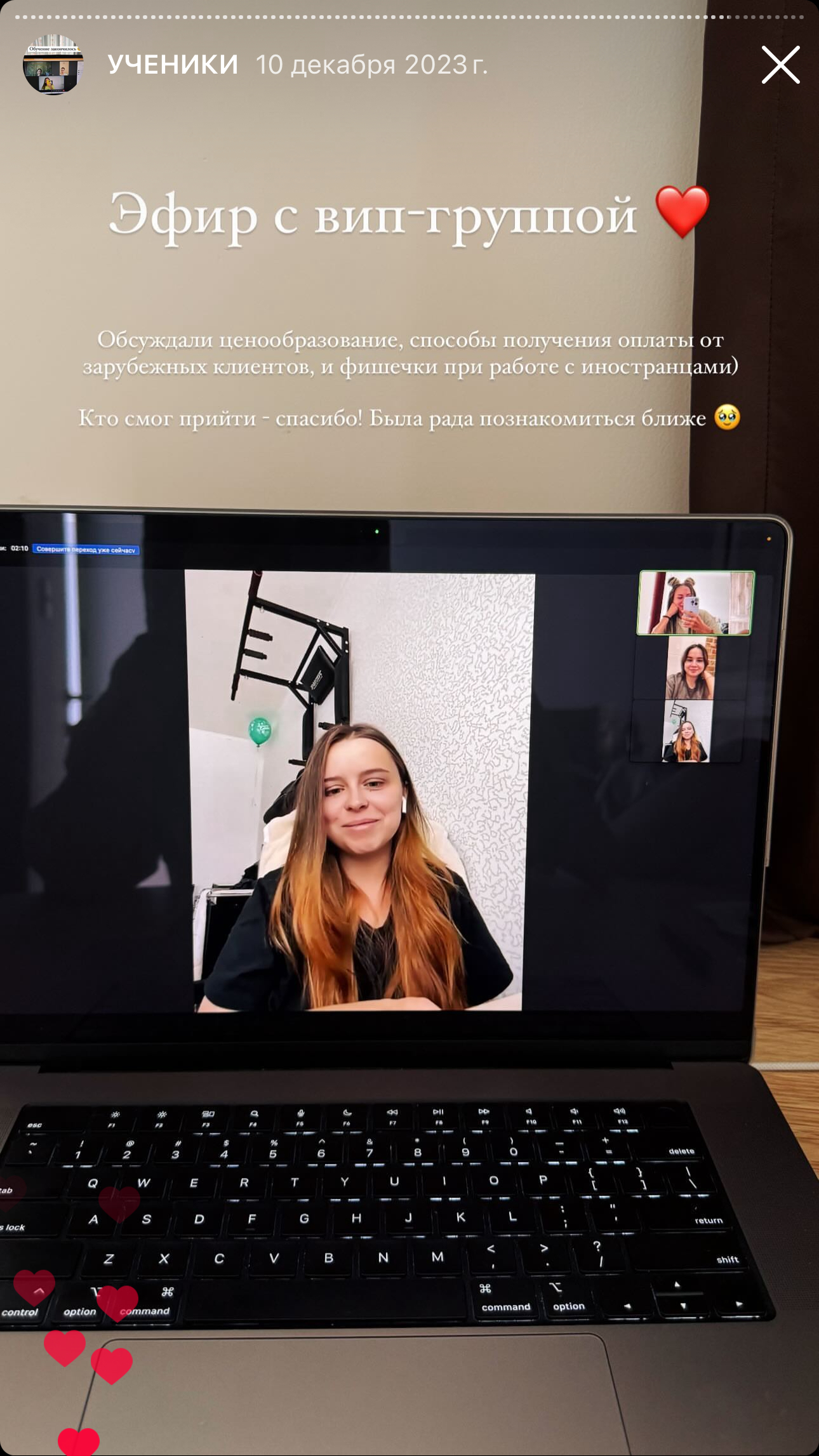 «Понравилось общение в чате, дополнительные задания, атмосфера, урок по рилс 🔥, уроки по С1 вообще 💥 ну и много нюансов по ретуши и продвижению. Мои ожидания от курса оправдались полностью и даже больше) Ну и за табличку по финансам отдельное спасибо!»