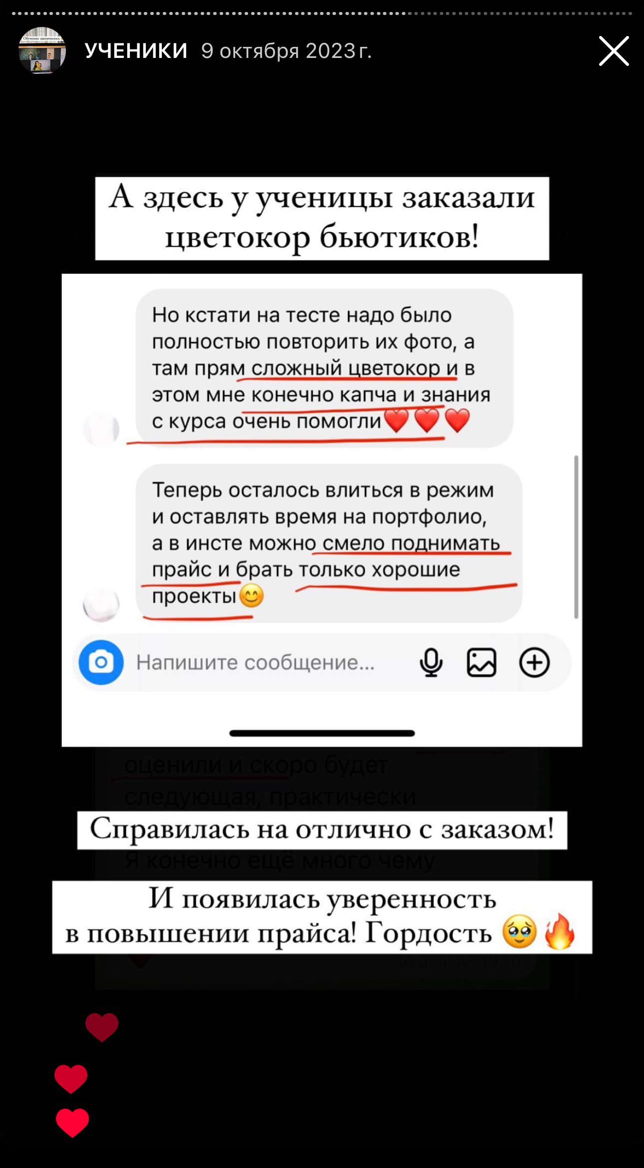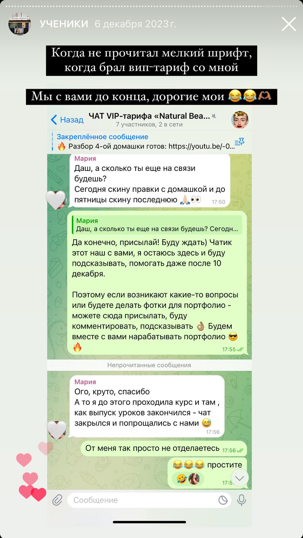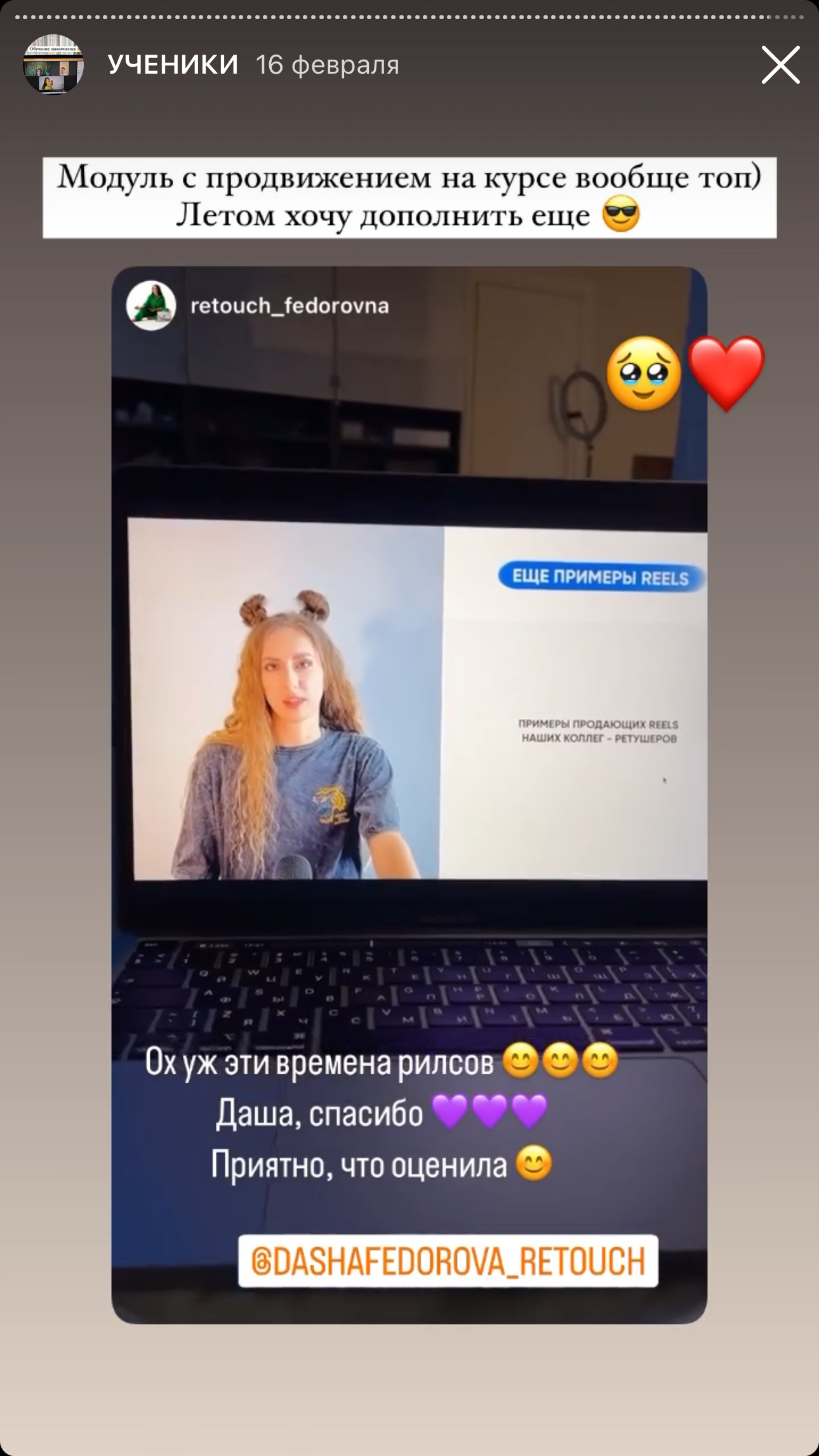 «Даша, спасибо за заботу об учениках)) так когда закончится доступ я не буду искать ответы на вопросы на сторонних источниках ❤️ Понравилась ёмкость материала, его структура, безусловно понятное знакомство с капчер, использую, но после ретуши), кисти, ими активно пользуюсь»