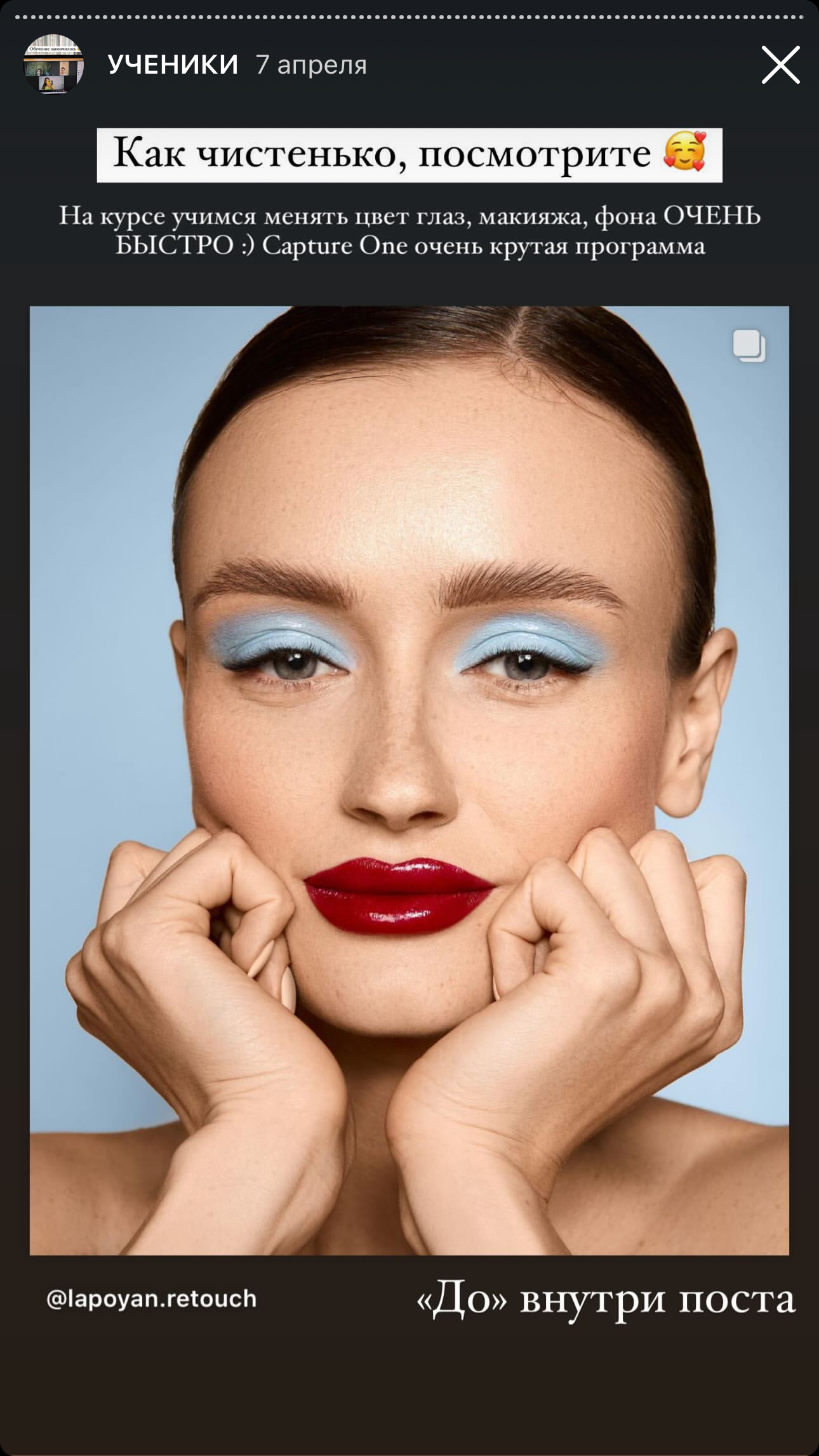 «…Очень повысила свой уровень ретуши, теперь знаю как сделать крутую текстуру кожи , не боюсь использовать частотку , нет страха превратить все в мыло. Раньше бы многое переделывала по новой, так как не было порядка. Программа Capture One вообще была открытием , до этого использовала только Adobe, но теперь цвет делать намного проще и быстрее. Так что сам курс превзошел ожидания Отдельная благодарность за обратную связь! Супер ответственный подход. Разборы домашек в видео, и все понятно как исправить и на что обратить внимание»